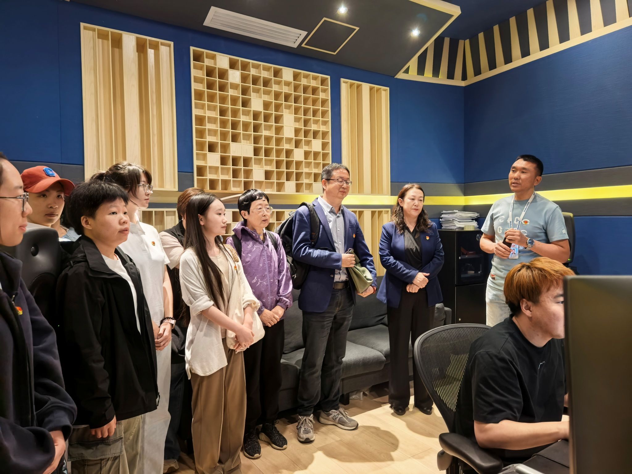 内蒙古民族语电影译制中心支部书记、总经理齐双宝,副总经理布仁门德热情接待来访师生。布仁门德带领师生参观了录音室、混音室等专业工作室,介绍了民族语电影译制的工作内容。他强调,民族电影译制对中华优秀传统文化的传播和中国电影“走出去”具有重要意义。