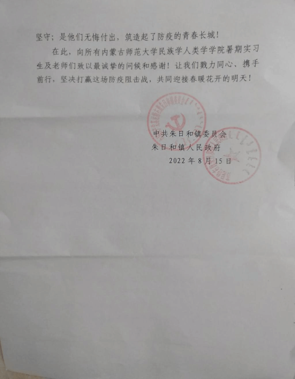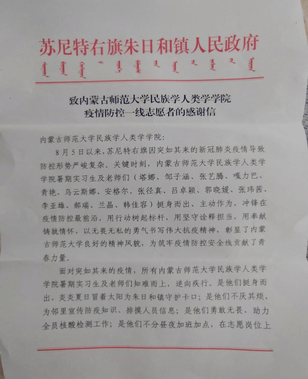 近日,苏尼特右旗朱日和镇人民政府向公司发来感谢信,对伟德官方网站田野调查师生在新冠肺炎疫情防控中的突出贡献表示感谢,赞扬公司师生在疫情防控中表现出的挺身而出、主动作为、无私无畏、勇于担当的精神风貌。