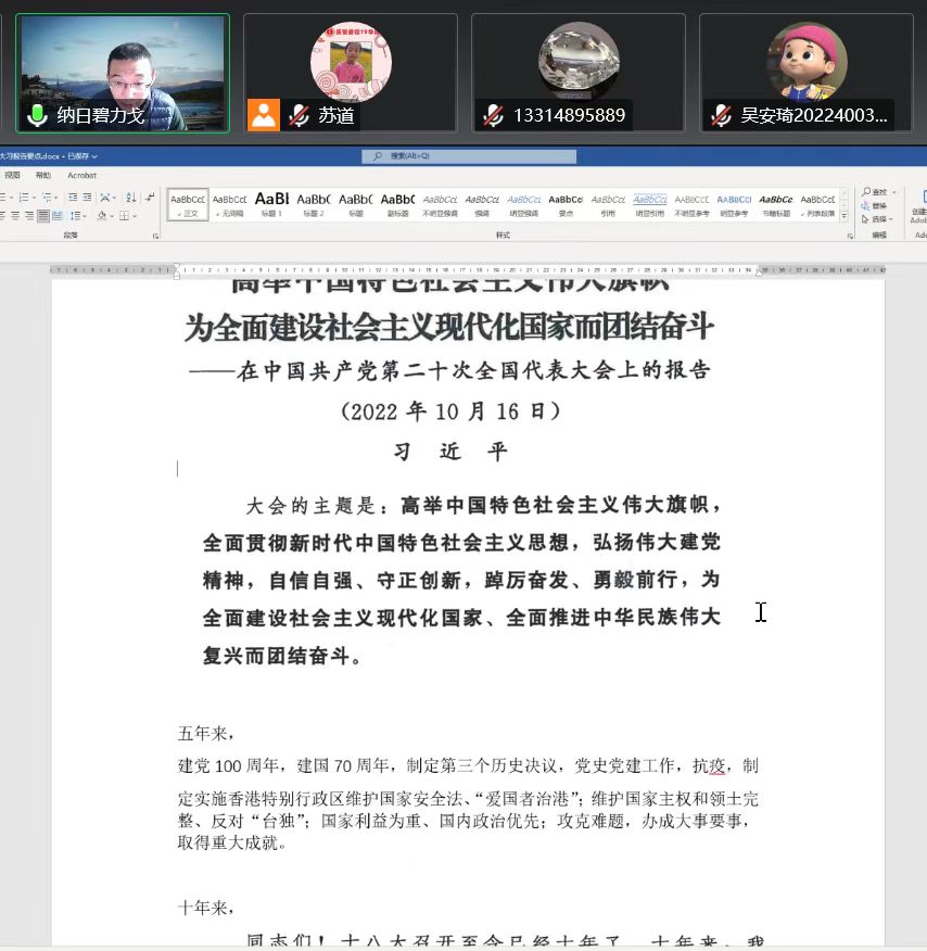 纳日碧力戈教授带领参会人员研读二十大报告的关键段落,分析新时代和到本世纪末的中心任务和战略部署,解释其中的核心要义。他指出,我们要结合基地实际工作,认真学习、深刻领会、贯彻执行党的二十大精神,积极制订落实措施,谋划践行路径,使之有形有感有效。