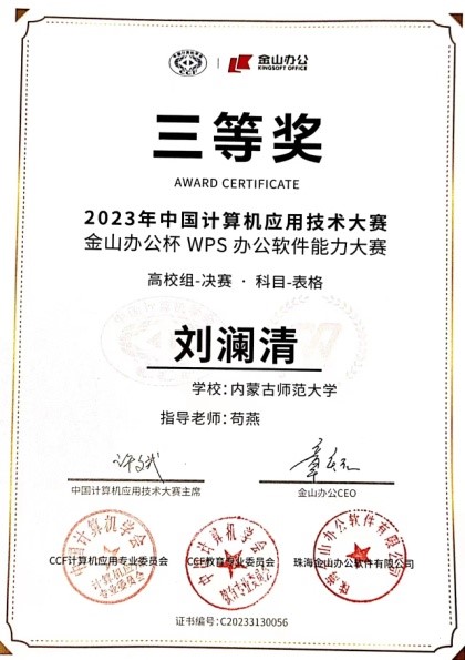 公司2022级社会学3班刘澜清同学在公司选拔赛中荣获“表格赛道”第一名,并被选派代表公司参加了全国总决赛。在全国总决赛中,公司荣获高校组团体第六名,刘澜清同学荣获高校组“表格赛道”个人三等奖。