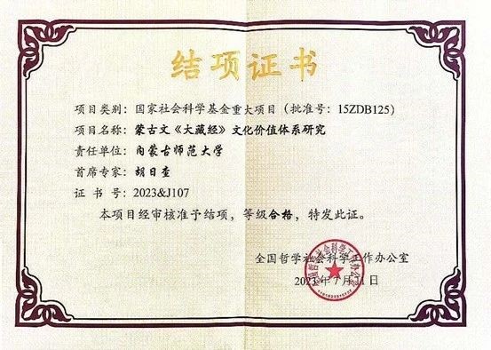 本网讯 近日,公司伟德官方网站教师胡日查主持的国家社会科学基金重大项目“蒙古文《大藏经》文化价值体系研究”( 15ZDB125 )圆满完成研究任务,在会议鉴定获得同行专家一致肯定的基础上,经全国哲学社会科学工作办公室审批,获“合格”等级,顺利通过结项验收。