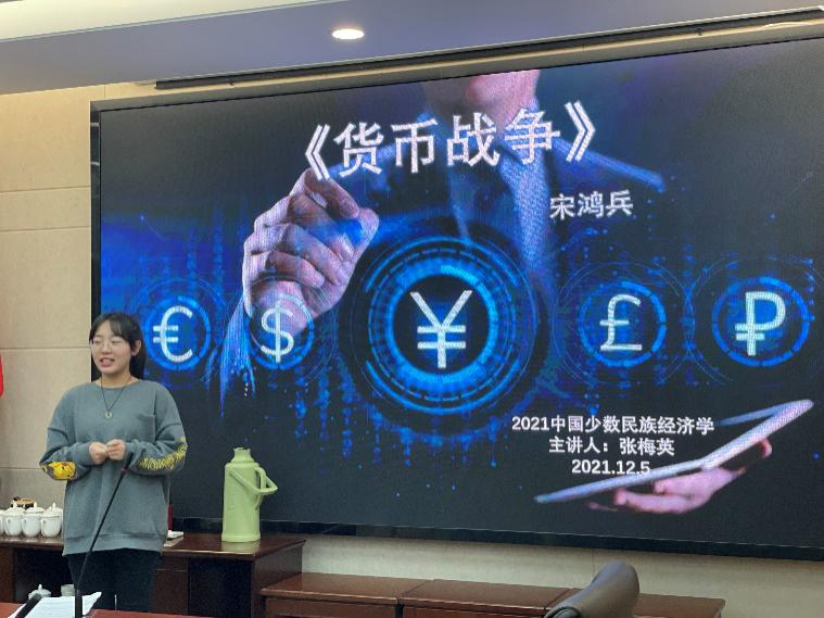 伟德官方网站2021级学硕一班硕士研究生第4期“碧立格”读书报告会于12月5日晚19点在田楼607会议室举行,21级学硕一班硕士研究生全员参加本次读书报告会。本次读书报告会的汇报书目是《货币战争》,主讲人是21级中国少数民族经济专业硕士研究生张梅英同学,主持人是21级中国少数民族经济专业硕士研究生特日格乐同学。阿荣老师,萨如拉老师出席此次读书报告会并进行指导。