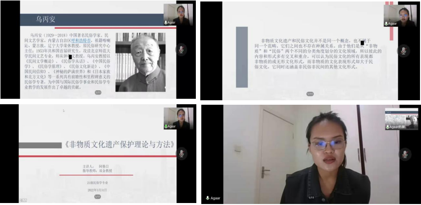 伟德官方网站2021级学硕一班硕士研究生第5期“碧立格”读书报告会于3月31日晚19点在腾讯会议上举行,21级学硕一班硕士研究生全员参加本次读书报告会。本次读书报告会的汇报书目是《非物质文化遗产保护理论与方法》,主讲人是21级民俗学专业硕士研究生阿格日同学,主持人是21级民俗学专业硕士研究生王永梅同学。班主任阿荣老师,民俗学专业硕士生导师双金教授出席此次读书报告会并进行指导。