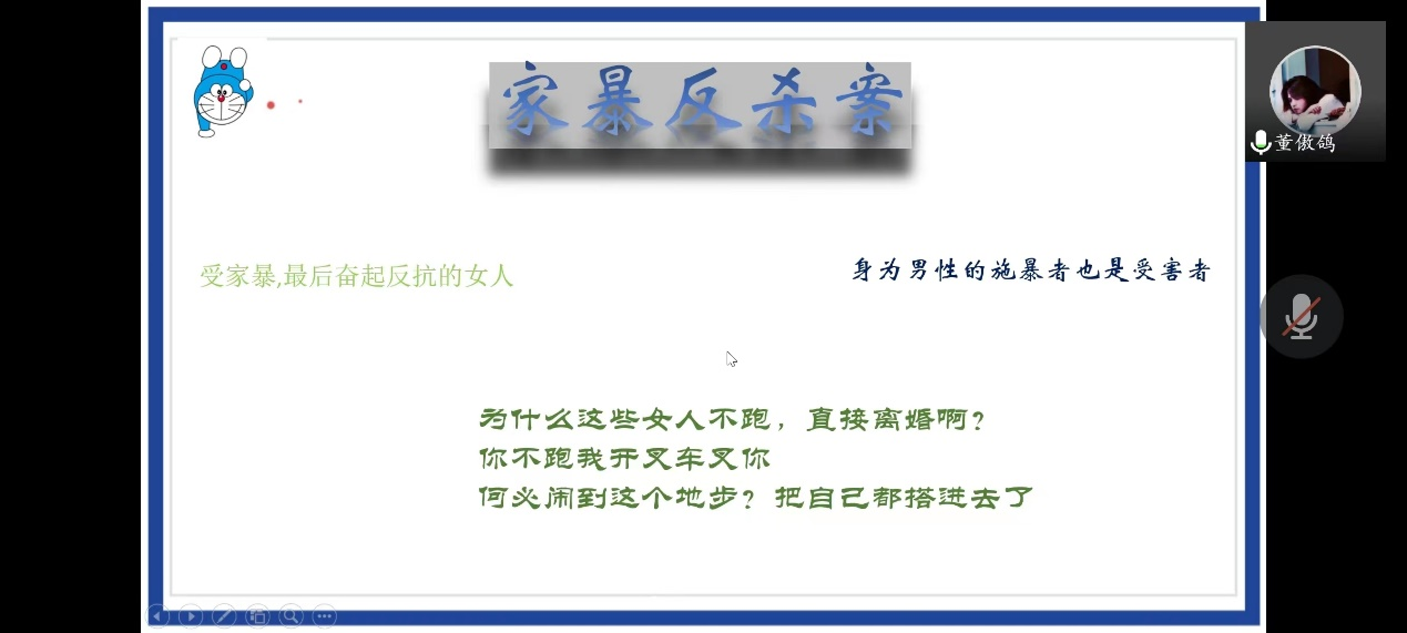 董傲鸽同学采用“多维”“惊讶”等关键词开始自己的分享。董傲鸽同学发现网络上人们对于“药家鑫杀人案”、“家暴反杀案”等案件的观点出奇的一致,都是聚焦在“用弹钢琴的手杀人”等片面的地方。