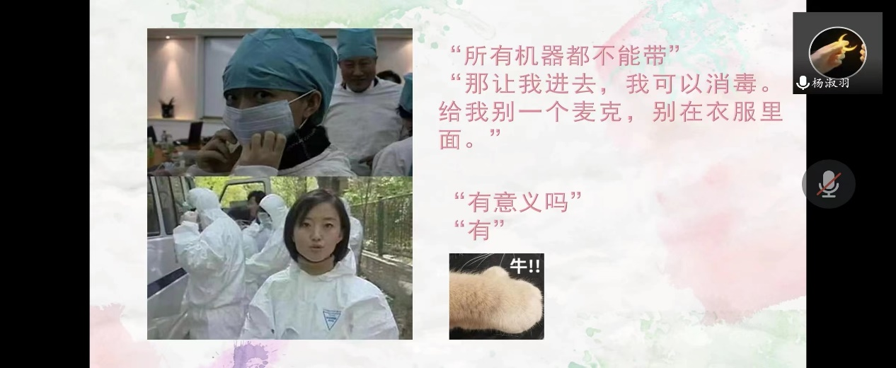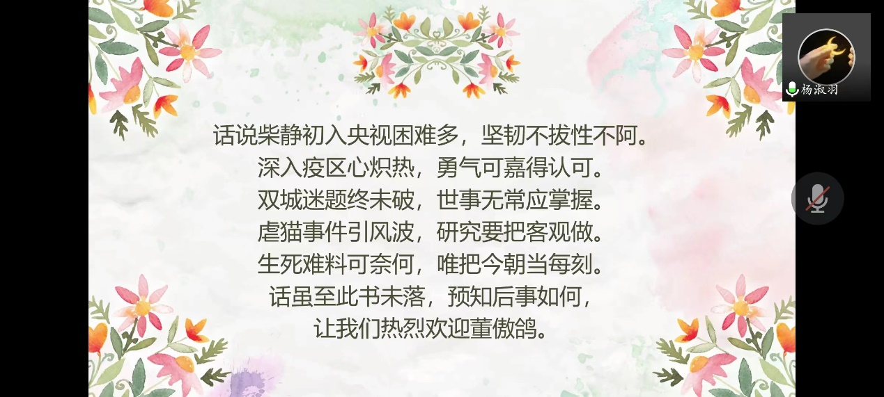 为使同学们更好地了解书中内容,杨舒羽同学收集、整理并展示大量的图片和视频,图文结合、影文结合地对本书的第一章、第二章、第三章、第十一章、第二十章等内容进行了详细的讲述,自己总结并表达了对事件和人物的看法。如在讲述非典疫情时,杨舒羽为柴静独自进入隔离病房的行为点赞。最后以一段说书人的经典台词结束自己的分享并引出董傲鸽同学。