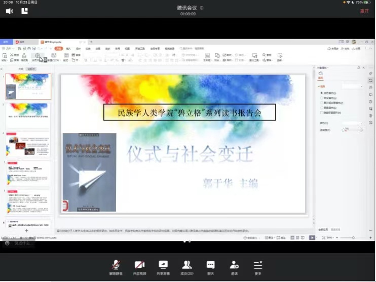 读书报告会共分两个环节进行:第一环节是两位主讲人分别分享《仪式与社会变迁》和《蒙古语人群的分子人类学溯源》两本著作,从作者介绍、著作内容、核心观点等方面进行了较详尽地介绍,并分享了学习心得。