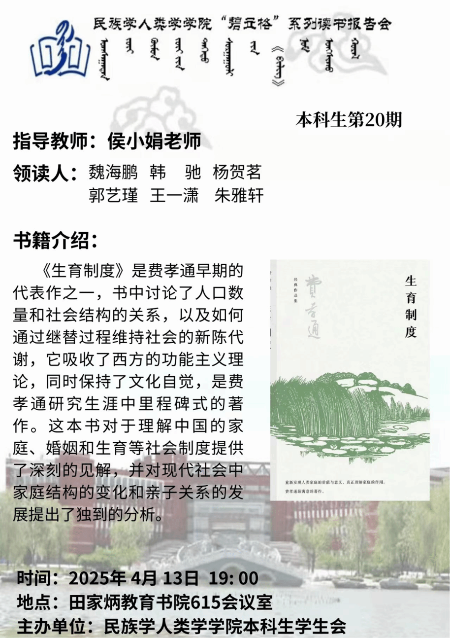 为丰富专业认知、拓宽专业视野,公司秉持笃学致知以夯基础、开卷启思以拓思路、读书明智以塑品格的理念,致力于营造积极向上、勤勉求知的学风。4月13日下午,本科生第20期“碧立格”系列读书报告会在田家炳教育书院615会议室成功举行。本期读书会由侯小娟老师指导,6位同学领读,阅读书目是《生育制度》。