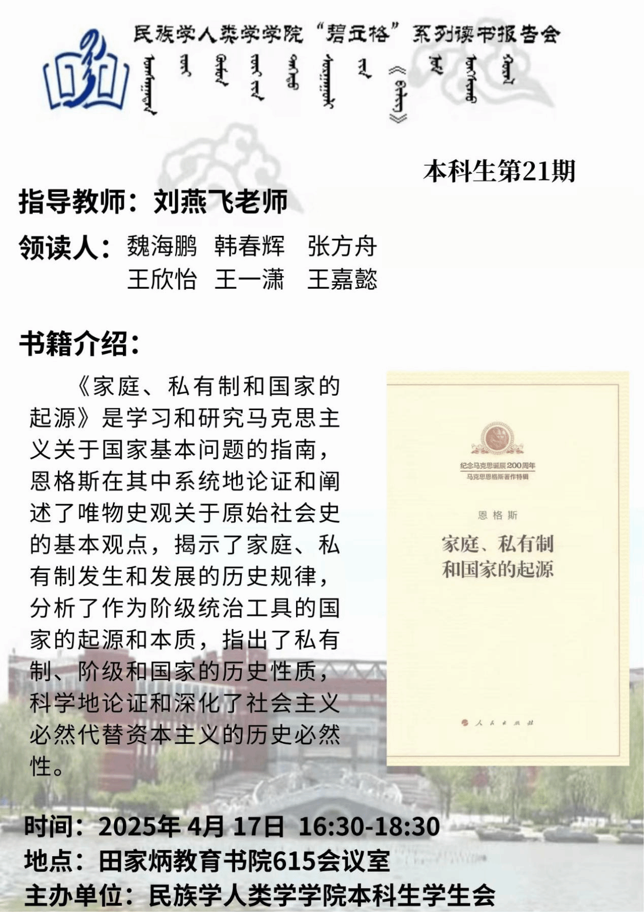 为丰富专业认知、拓宽专业视野,公司秉持笃学致知以夯基础、开卷启思以拓思路、读书明智以塑品格的理念, 致力于营造积极向上、勤勉求知的学风。 417日下午,本科生第21碧立格系列读书报告会在田家炳教育书院615会议室成功举行。本期读书会由刘燕飞老师指导,6位同学领读,阅读书目是恩格斯的《家庭、私有制和国家的起源》。