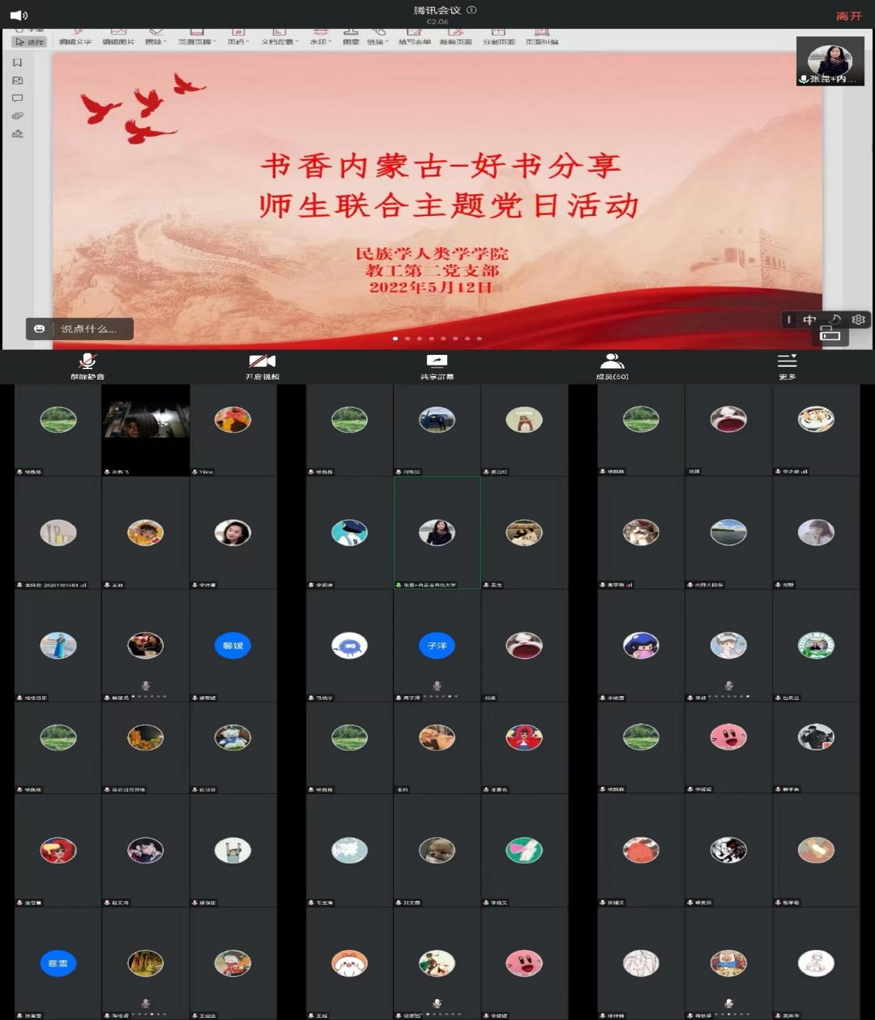教工第二党支部于2022年5月12日晚上在线上开展支部活动。会议由教工第二党支部书记刘燕飞主持,公司党委书记包凤兰以及陶格斯、韦兰海等党员同志共同参加会议,同时邀请2020级社会学专业全体同学席会议。