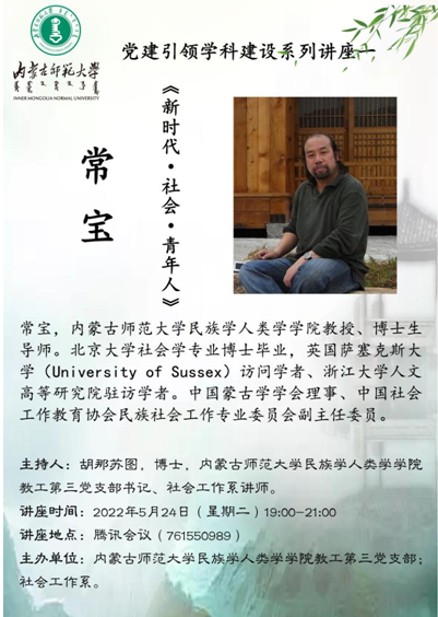 2022年5月24日 晚19点由伟德官网教工第三党支部和社会工作系联合举办“党建引领团队建设系列讲座一”之《新时代·社会·青年人》主题讲座。讲座由伟德官方网站教授、博士生导师常宝主讲,教工第三党支部书记胡那苏图主持,公司内外150余人参与讲座。