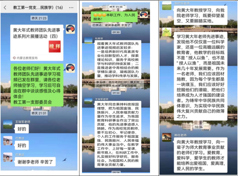学习后,党员同志们感受颇多,在学习群中自由发表了自身的学习心得和感悟。多数教师党员认为模范就在身边,不用好高骛远,只要脚踏实地,兢兢业业,便是对黄大年老师及众多模范教育工作者精神的最大领悟。还有教师党员认为成果不是说出来的,而是一丝不苟的干出来的,多做实事才是硬道理。新入职的年轻党员教师同志们更是备受先进事迹的鼓舞,立志在岗位上,认真教学、认真科研,努力做一名合格的教师和一名合格的党员,把教学科研做在祖国的大地上。